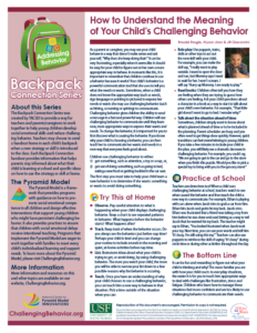 The Backpack Connection Series was created by TACSEI to provide a way for teachers and parents/caregivers to work together to help young children develop social emotional skills and reduce challenging behavior. Teachers may choose to send a handout home in each child’s backpack when a new strategy or skill is introduced to the class.