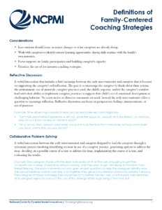 This resource provides definitions and examples that illustrate family coaching strategies. These strategies are used by early interventionists to support caregivers as they build their competence and confidence in supporting their child’s social emotional development.