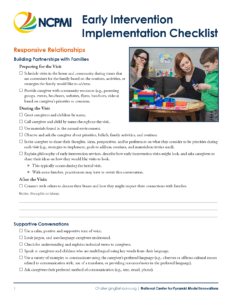 The Early Intervention Implementation Checklist is designed to align with the Early Intervention Pyramid Practices Fidelity Instrument (EIPPFI). Coaches and early interventionists can use this tool to support early interventionists’ self-reflection of the implementation of Pyramid practices, and prepare for shared goals and action planning.