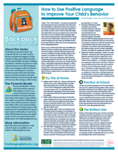 The Backpack Connection Series was created by TACSEI to provide a way for teachers and parents/caregivers to work together to help young children develop social emotional skills and reduce challenging behavior. Teachers may choose to send a handout home in each child’s backpack when a new strategy or skill is introduced to the class.