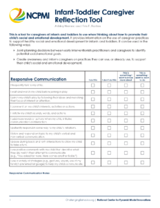 This tool provides information on the use of caregiver practices to support healthy social emotional development in infants and toddlers. Early interventionists and caregivers can use this tool to build awareness and inform caregivers about what practices they currently use or can use to support their child’s healthy social emotional development. This tool might also be used to aid joint planning decisions when identifying social emotional goals with caregivers.