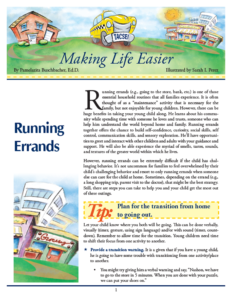 Running errands (e.g., going to the store, bank, etc.) is one of those essential household routines that all families experience. It is often thought of as a ?maintenance? activity that is necessary for the family, but not enjoyable for young children. While there can be huge benefits in taking your young child along, running errands can be extremely difficult if the child has challenging behavior. Still, there are several steps you can take to help you and your child get the most out of these outings. Also includes a handy tip card for quick reference.