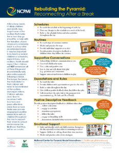 Rebuilding the Pyramid: Reconnecting After a Break is a one page tip sheet to help preschool practitioners intentionally plan and think about how to support children’s use of social and emotional skills that are important to re-teach or remind children after being away from a classroom. Areas to focus on include: schedules and routines, supportive conversations, expectations and rules, positive descriptive feedback and emotional support.