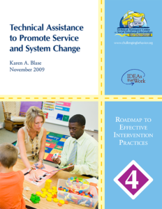 The purpose of this TACSEI Roadmap document is to assist a range of stakeholders (e.g., early childhood service providers, parents, technical assistance providers) understand the types of TA that are most beneficial for achieving particular practice and systems outcomes. The paper explores and highlights TA strategies to initiate, implement, and sustain effective practice and systems change. The content of this Roadmap is based on a broad literature related to practice, service, and systems change, data and information related to TA across a number of domains (e.g., special education, general education, community prevention, aid for developing countries), and data and best practices related to implementation and scaling up of evidence-based practices (November, 2009).