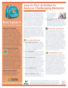 The Backpack Connection Series was created by TACSEI to provide a way for teachers and parents/caregivers to work together to help young children develop social emotional skills and reduce challenging behavior. Teachers may choose to send a handout home in each child’s backpack when a new strategy or skill is introduced to the class.
