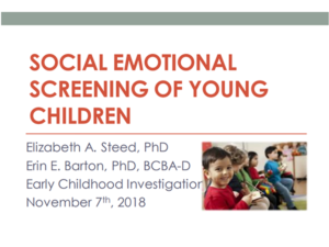 In this webinar, assessment and intervention experts, Erin Barton, PhD and Elizabeth Steed, PhD, describe the purpose of social-emotional screening of young children in the context of promoting social-emotional development and identifying children at risk for social-emotional difficulties. This webinar provides an overview of specific social-emotional screening tools and how one might pick a tool for their program’s use. The presenters use a case study to illustrate how to implement one of the most widely used tools, ASQ:SE-2, and make decisions about next steps for children at risk for social-emotional challenges.