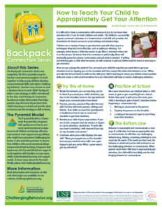 The Backpack Connection Series was created by TACSEI to provide a way for teachers and parents/caregivers to work together to help young children develop social emotional skills and reduce challenging behavior. Teachers may choose to send a handout home in each child’s backpack when a new strategy or skill is introduced to the class.