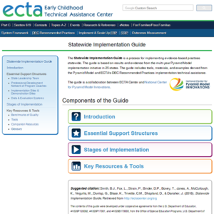 The Statewide Implementation Guide is an important resource for the use of this approach. The guide is based on results and evidence from the multi-year Pyramid Model implementation initiative in 25 states. It includes tools, materials, and examples derived from the Pyramid Model and ECTA’s DEC Recommended Practices implementation technical assistance (Smith et al., 2017).