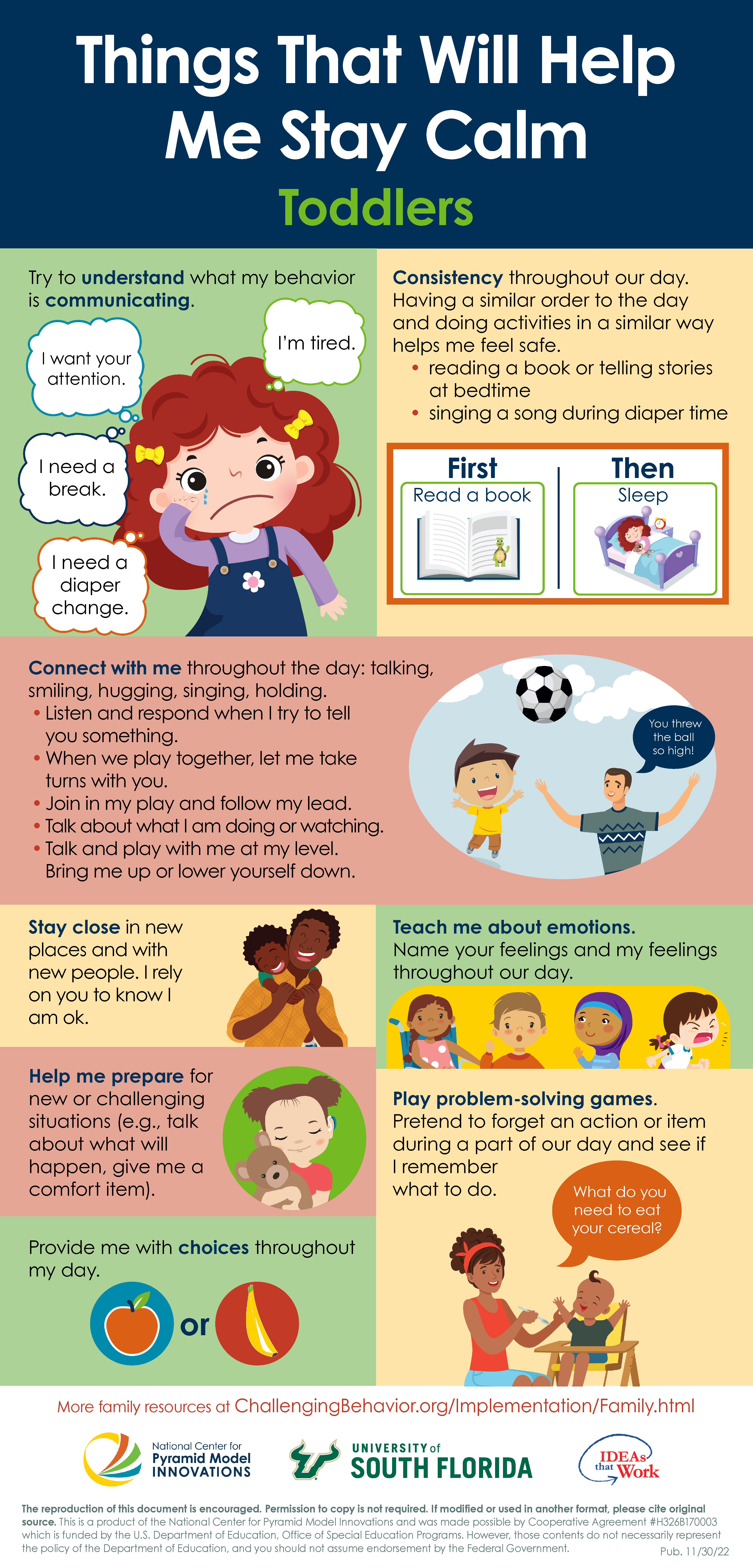 Toddlers experience big emotions as they learn to make meaning of their world and communicate their needs. Toddlers look to their primary caregivers to let them what they are experiencing is okay. Caregivers can use the strategies included in this infographic to provide toddlers with predictability in their day, safety in relationships, meaning to their experiences and emotions, and begin to build their problem-solving skills.