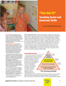 In this article we look at the secondary level of the teaching pyramid, which emphasizes planned instruction on specific social and emotional skills for children at risk for developing more challenging behavior, such as severe aggression, property destruction, noncompliance, or withdrawal. Children who may be considered at risk for challenging behavior are persistently noncompliant, have difficulty regulating their emotions, do not easily form relationships with adults and other children, have difficulty engaging in learning activities, and are perceived by teachers as being likely to develop more intractable behavior problems. (Published in Young Children, November 2006)
